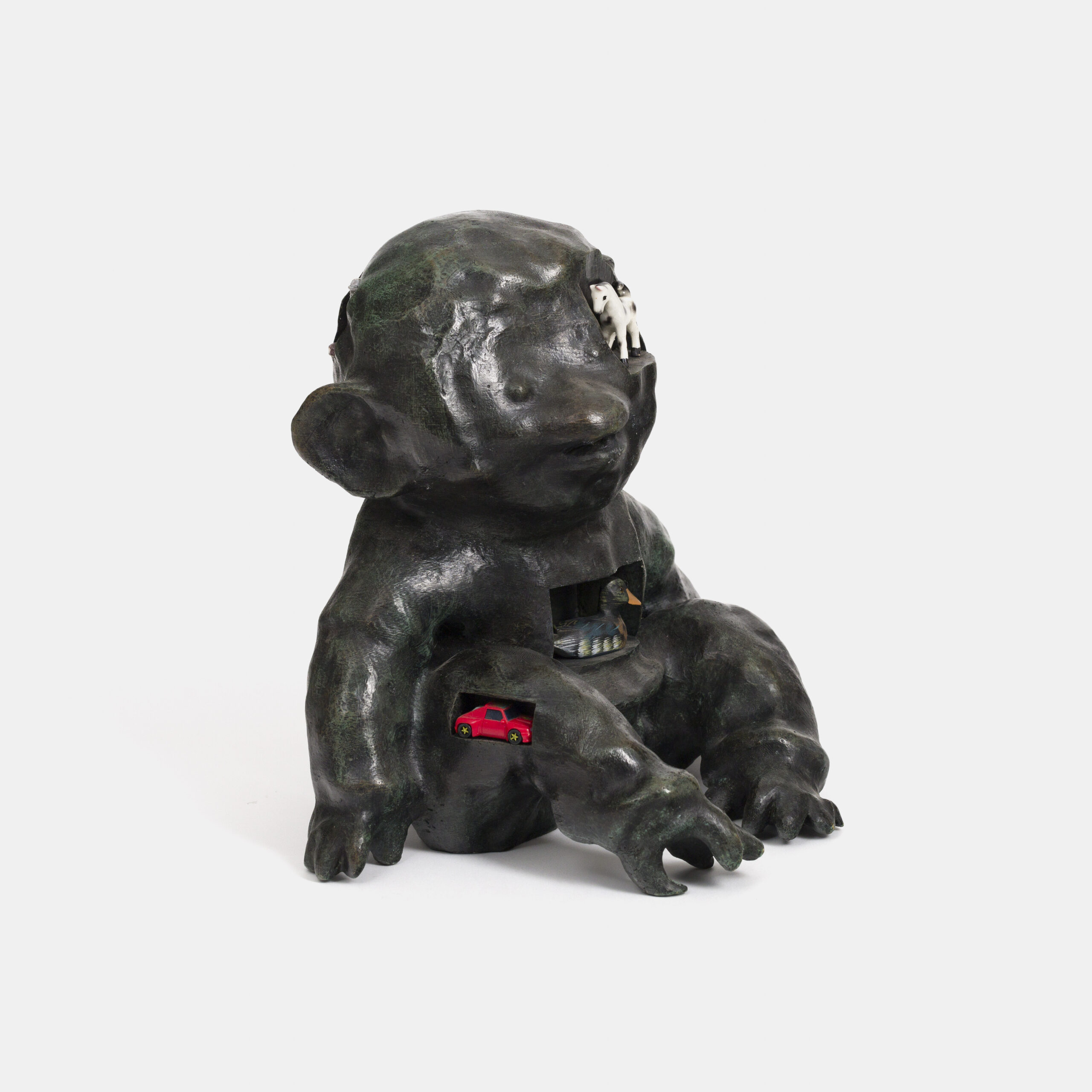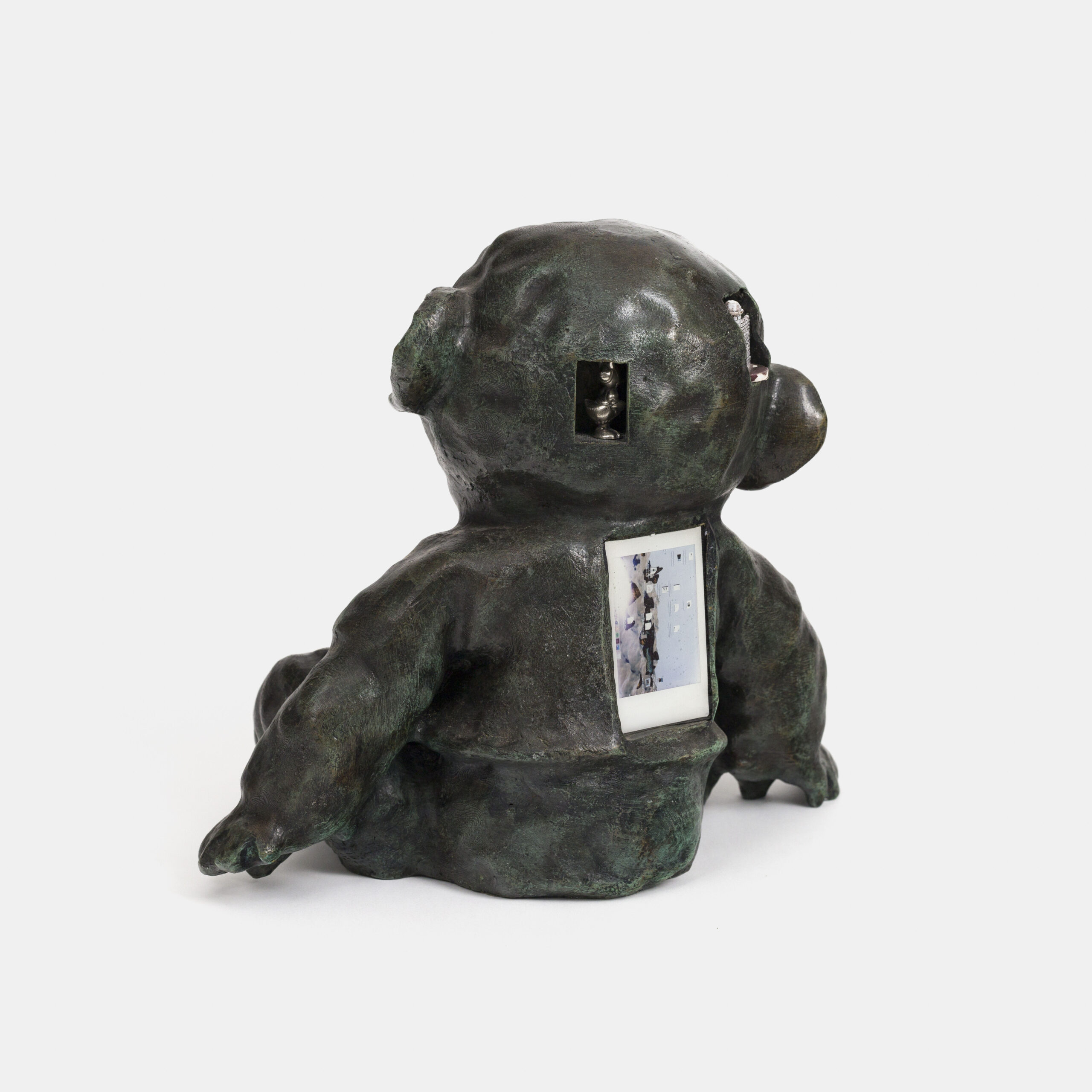 Bronce, fotografía con resina, figuras de madera, plástico y porcelana