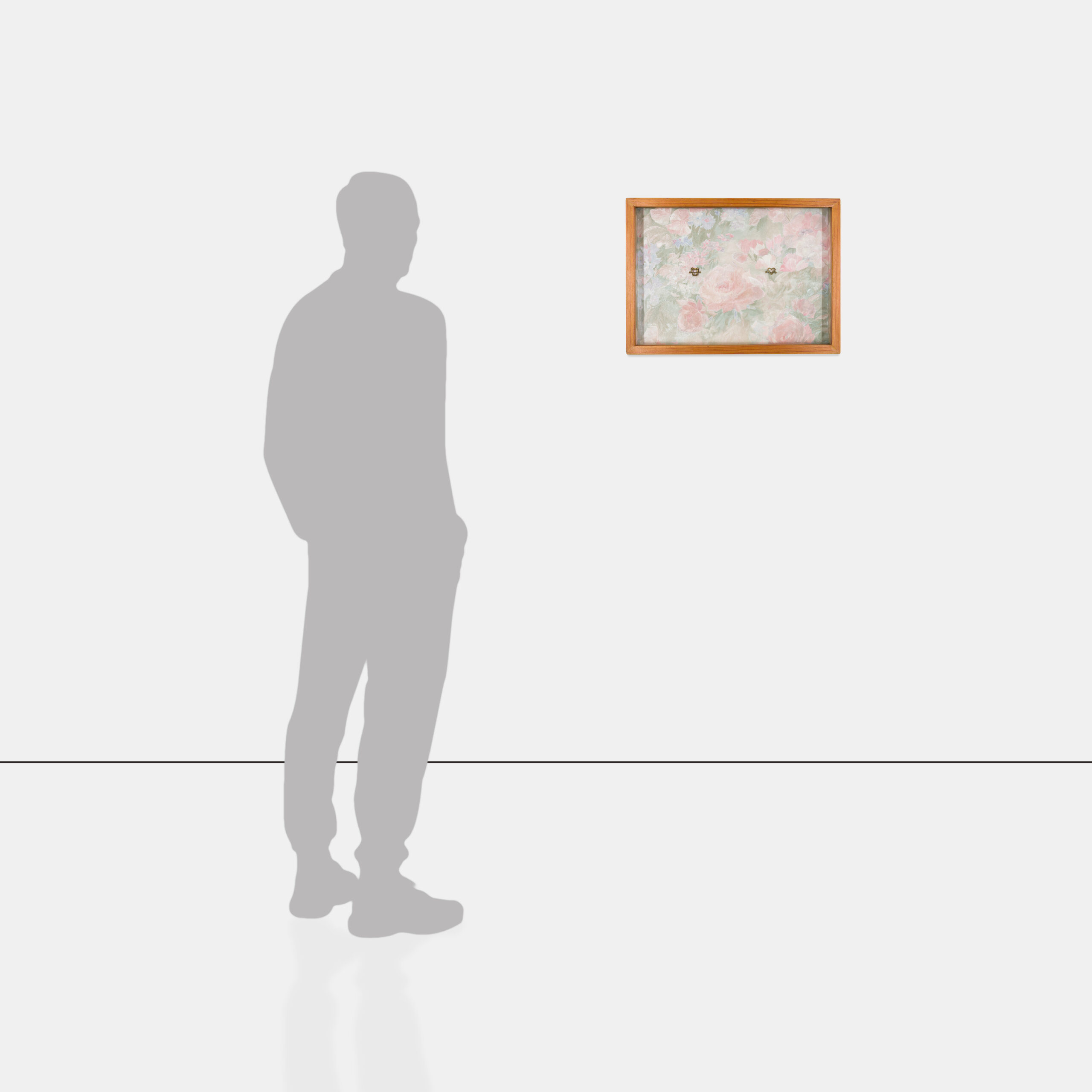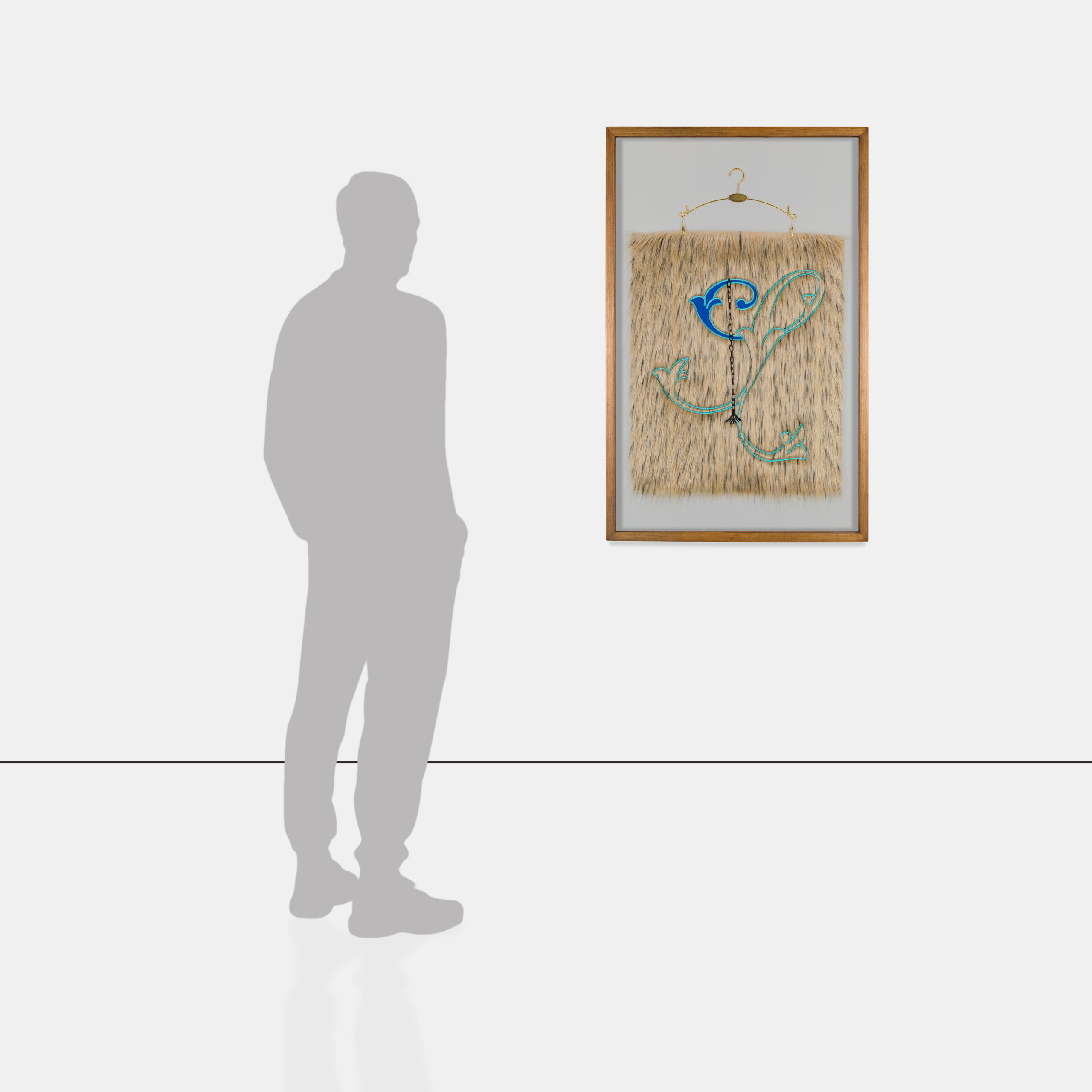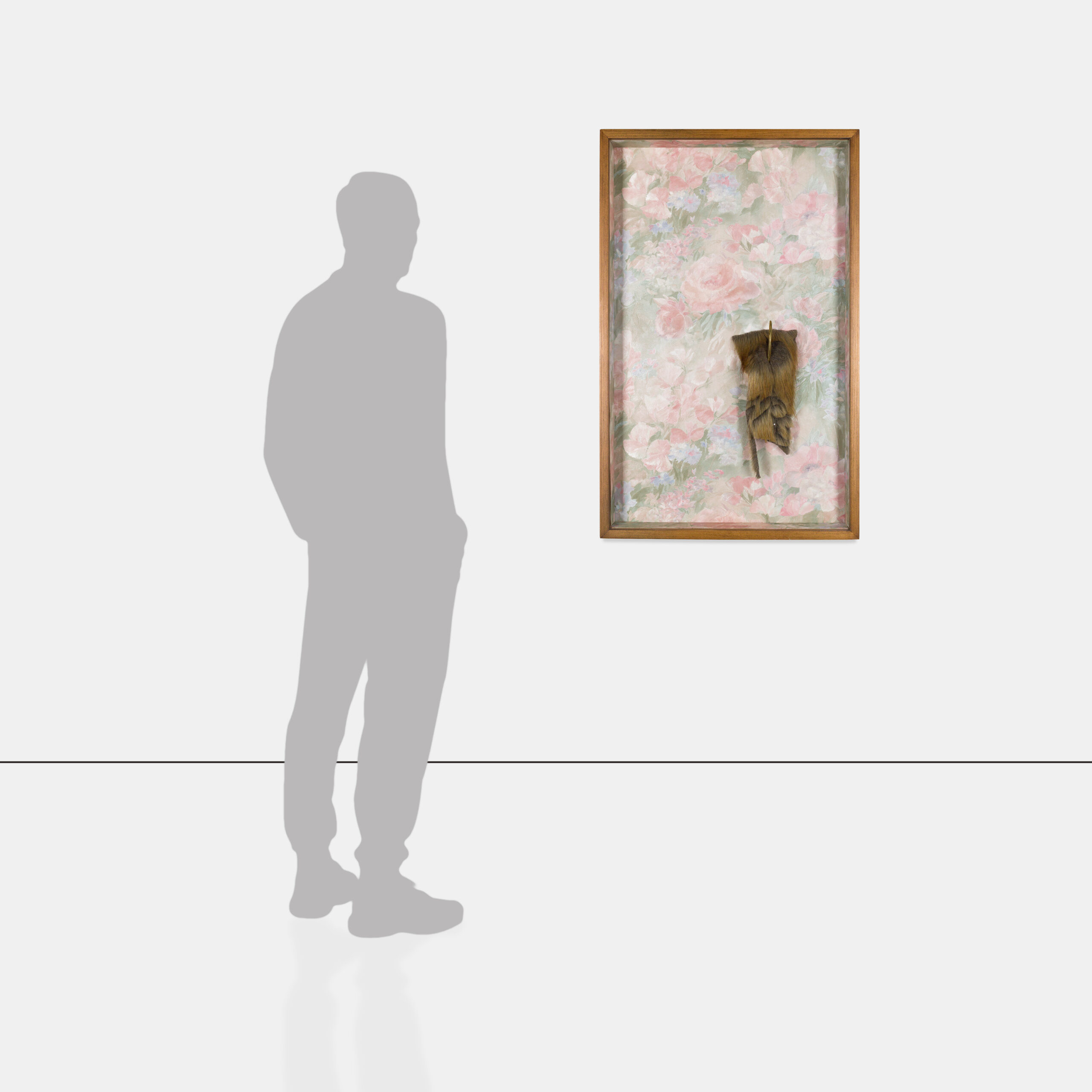 Piel sintética intervenida, fundición en metal a la cera perdida, cristal termo adhesivo y papel tapiz.