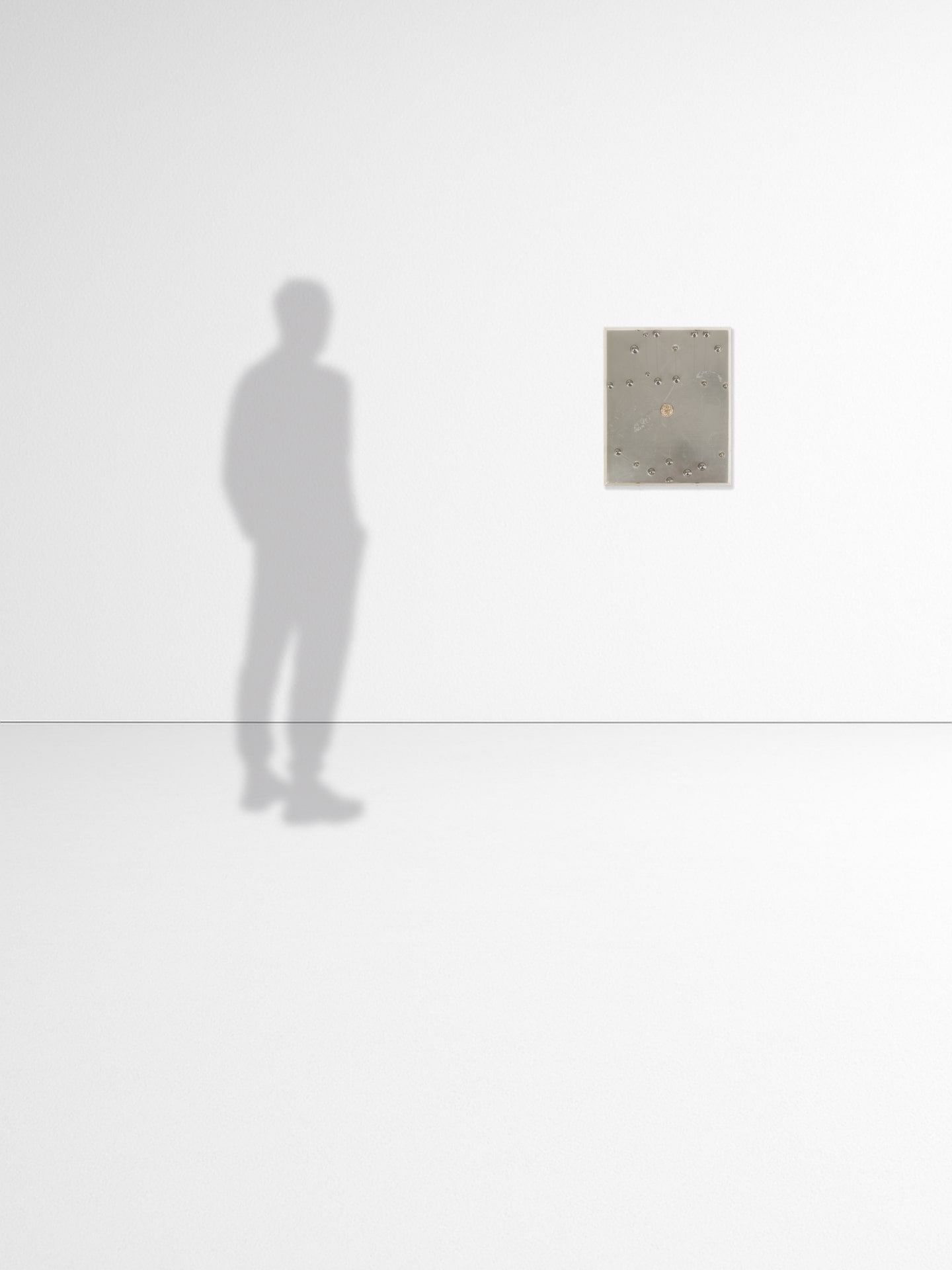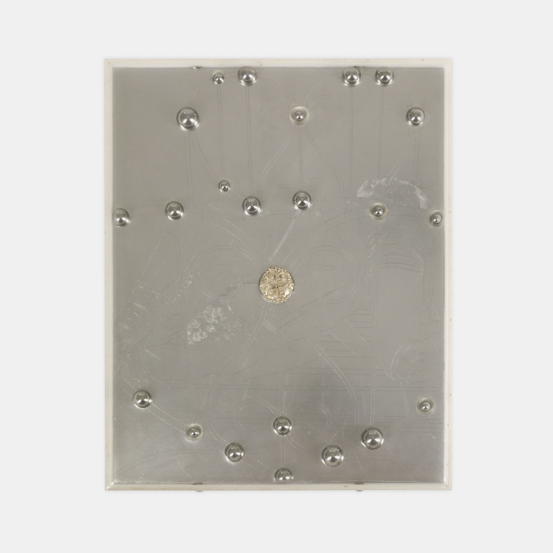 Juego de balines, placa de aluminio grabada con láser, pieza de cobre bañada en plata, resina epóxica, caja de acrílico.