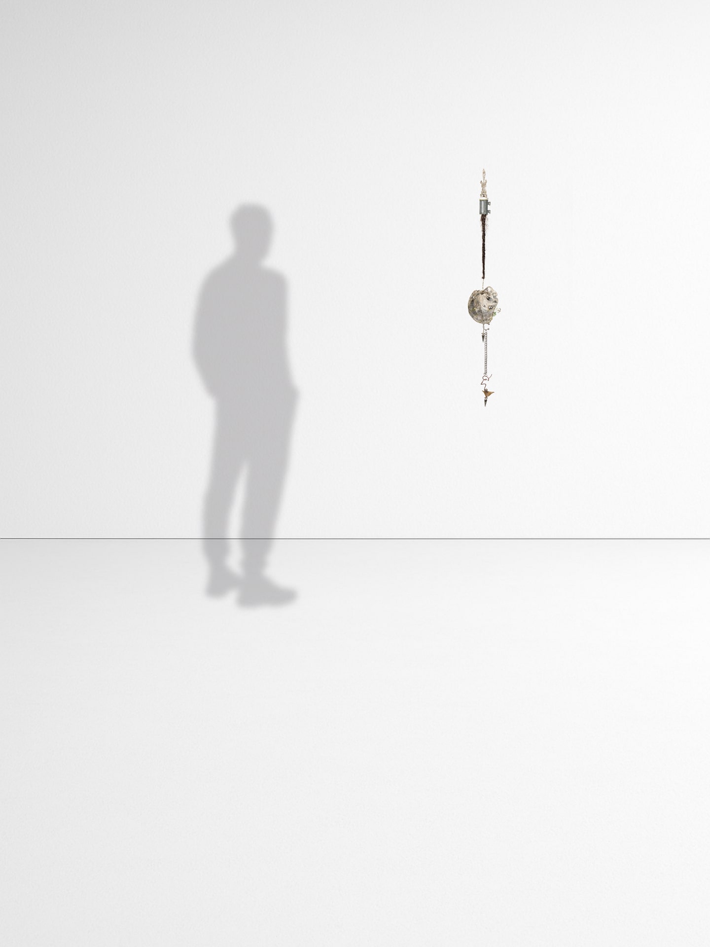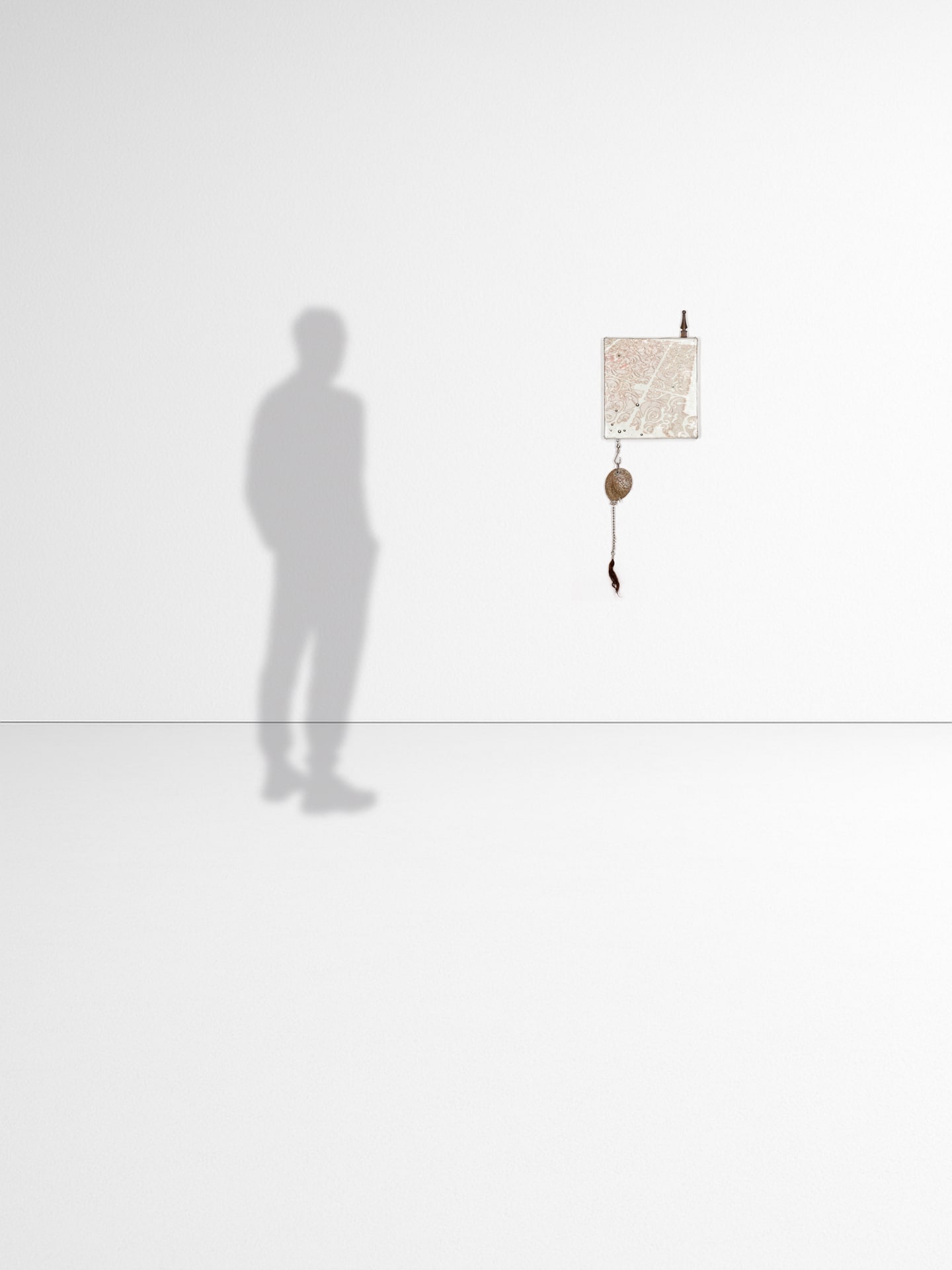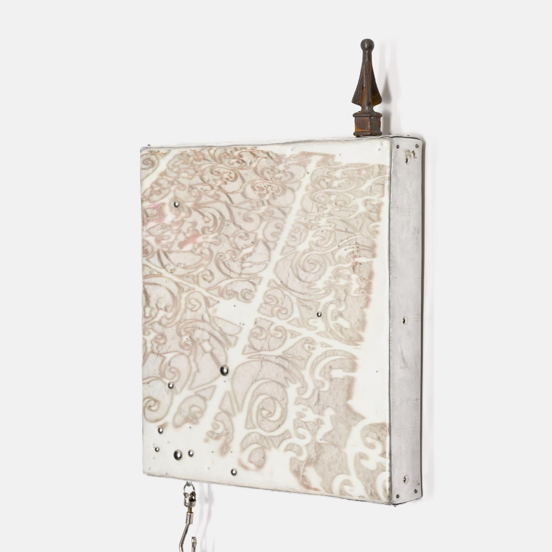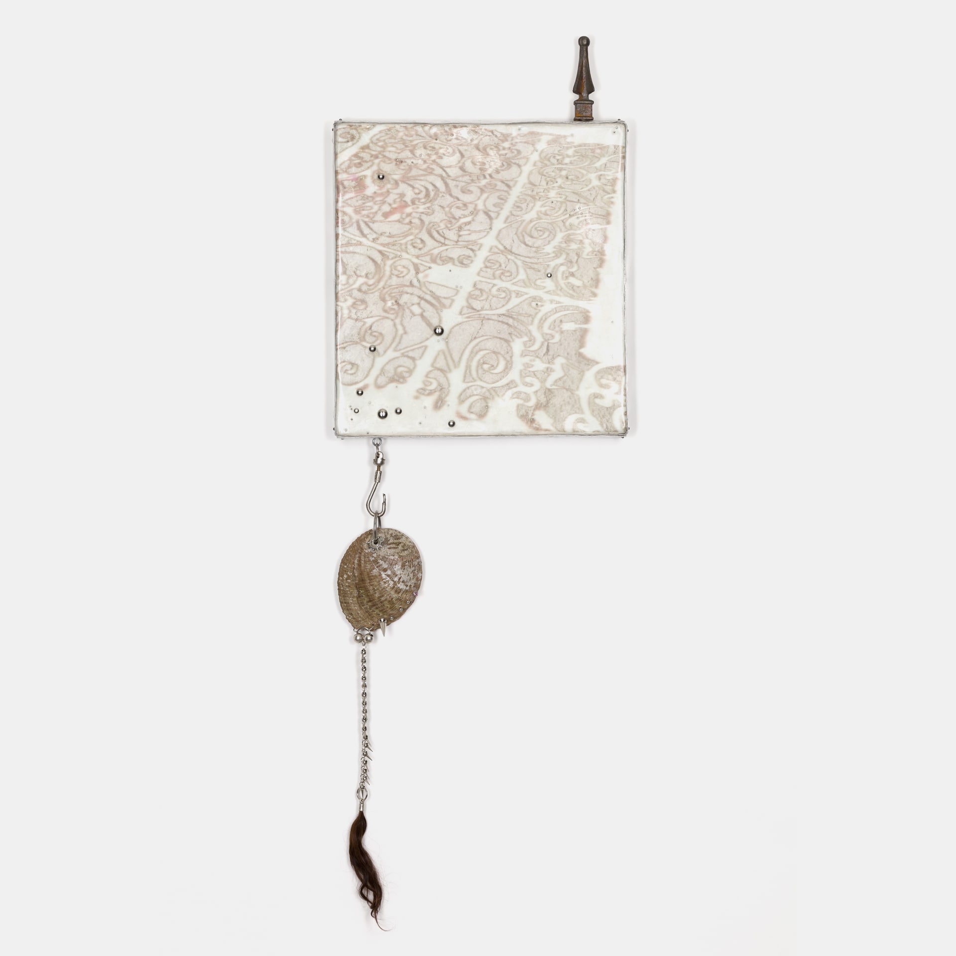 Cuadro de transferencia de imagen, silicón translúcido, remaches, aluminio, clavos, punta de lanza de barda, concha intervenida con espinas de rosal, percings, pelo y detalles de metal