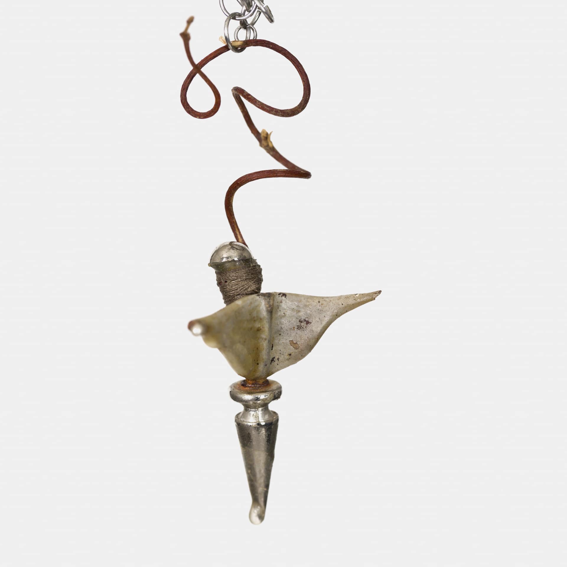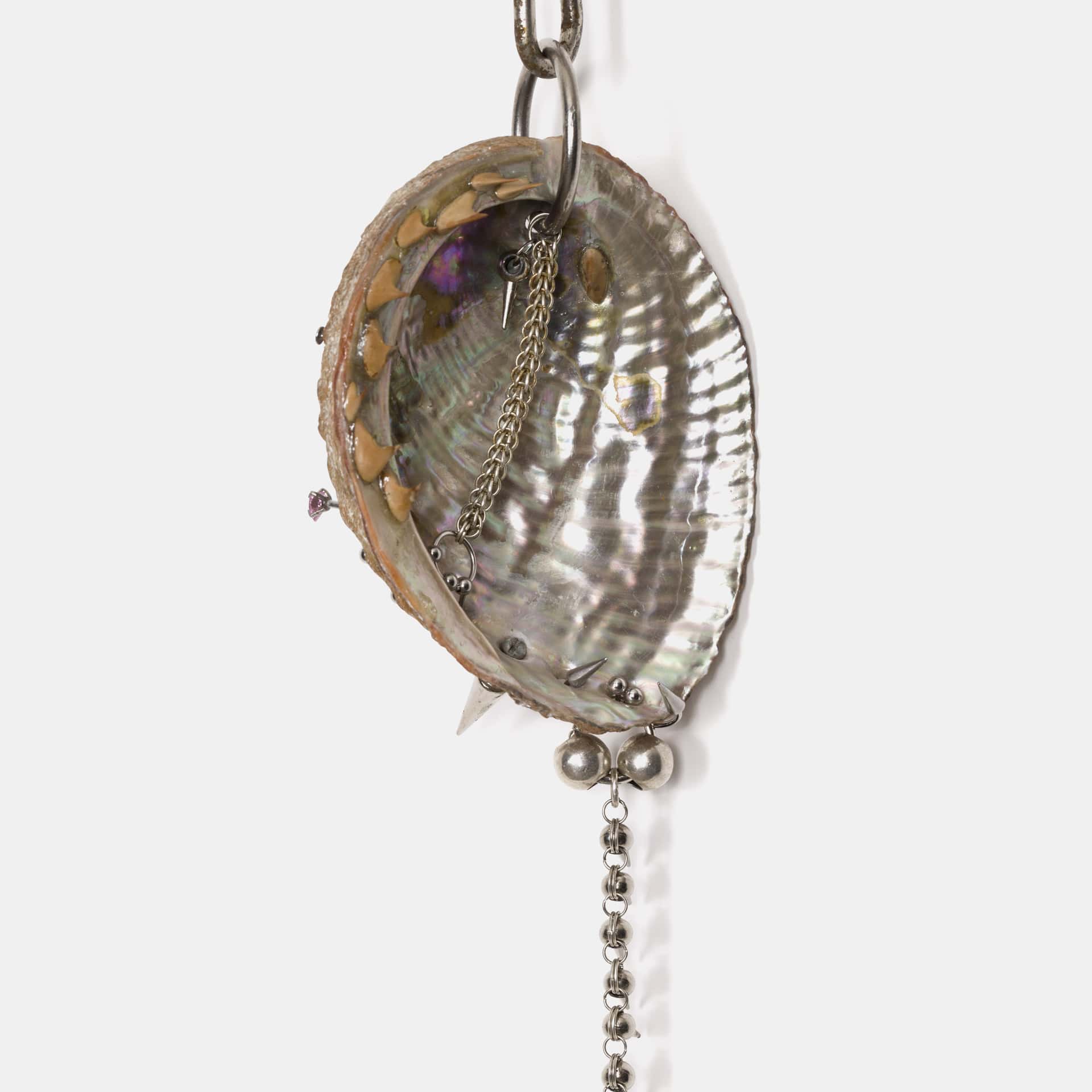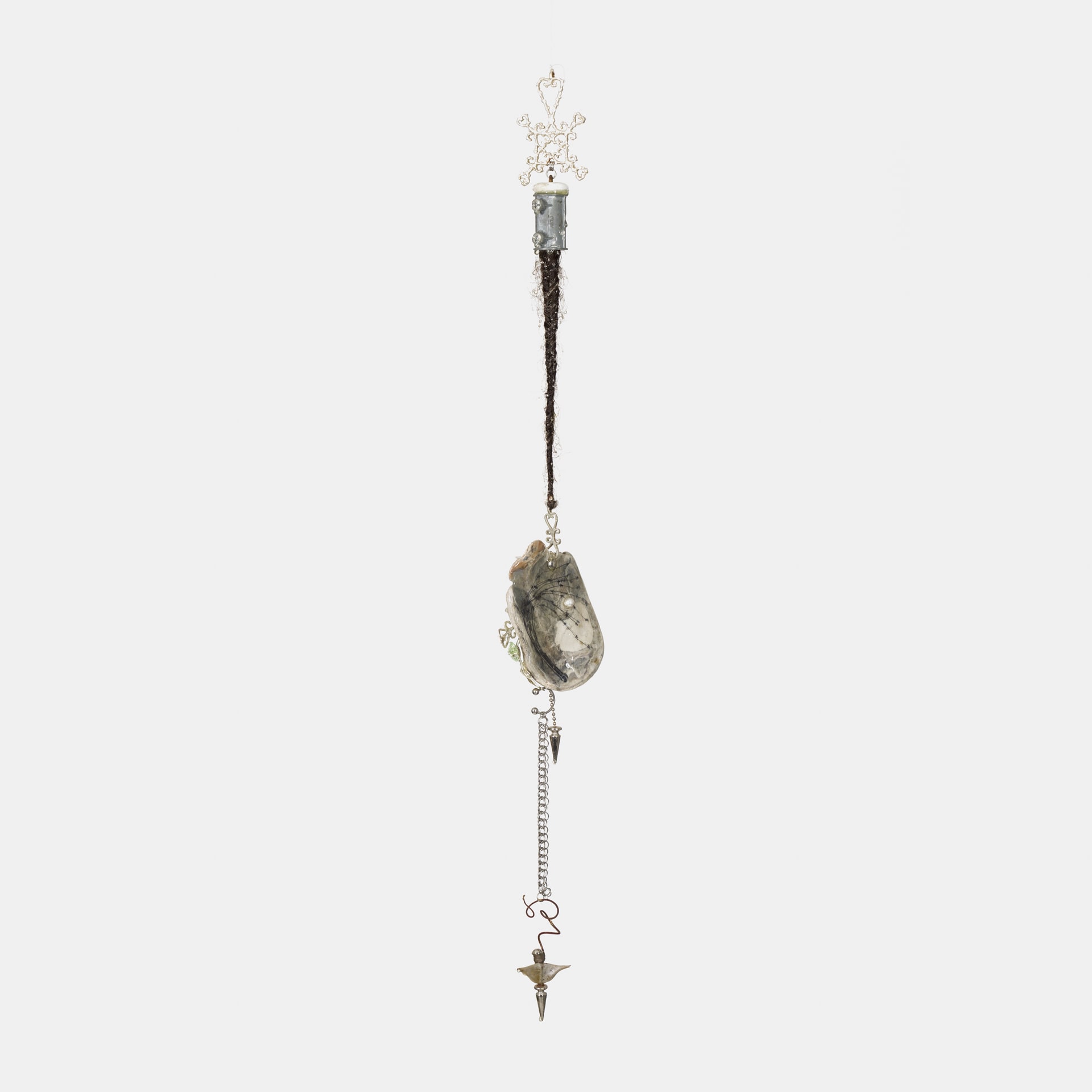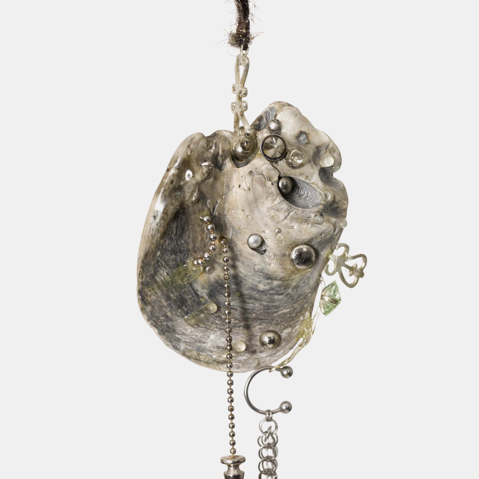 Concha de mar, detalles de metal, piezas de cobre bañadas en plata, perlas, piedra preciosa, resina epóxica, pelo humano, transferencia de imagen, semilla y cadena oxidada